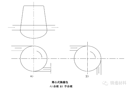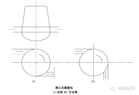 ④集渣式浇注系统 在横浇道中局部加高的结构称为集渣包;集渣包的形式分两类:一类是锯齿形集渣包,另一类是离心式集渣包。当金属液流经此处因断面扩大而流速下降,使杂质易于上浮并停留在该处。锯齿形集渣包一般逆齿比顺齿效果好。离心式集渣包一般设在横浇道末端,直接同内浇道相连,金属液从切线方向进入集渣包,产生涡流,在离心力作用下杂质向中心集中并上浮于液面。离心式集渣包出口截面应比入口截面小,出口方向必须与液流方向相反。离心式集渣包常用于球墨铸铁件的浇注系统,又称离心式集渣包为暗冒口,因为它既能集渣又能补缩。离心式集渣包见图所示。