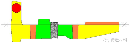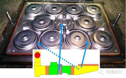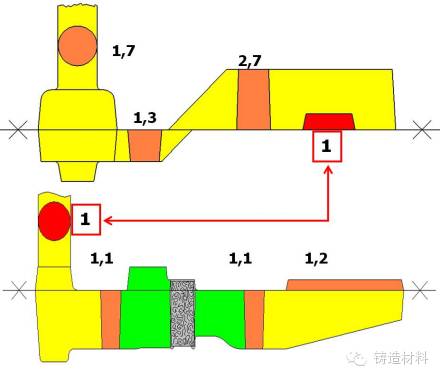 3).对于结构复杂的铸件,往往采用定向凝固与同时凝固相结合的所谓“较弱定向凝固”原则布置内浇道。即对每一个补缩区按定向凝固的要求设置内浇道,按同时凝固的要求采用多个内浇道充型。这样设置即可使铸件各厚大部位得到充分补缩而不产生缩孔和缩松,又可将应力和变形减到最小程度。