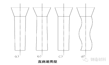 直浇道:浇注系统中的垂直通道为直浇道。直浇道的最小直径不小于15~18mm,直浇道顶端应高出铸型内腔顶端100~200mm。a型是斜度为1:50的正圆台形直浇道,它浇注时充型快,金属液在直浇道中呈正压状态流动,可防止气体和熔渣卷入铸型。b型与a型相反是倒圆台型直浇道,直浇道固定在模板上,一般用于机器造型中,这时要增加直浇道出口的阻力,如在横浇道中增加过滤器,使直浇道内充满并呈正压状态流动。c型多用于铸钢件生产中,采用耐火材料烧结的管件作直浇道,以增加其强度、耐火度和防止冲砂。d型直浇道用于非铁合金铸件,主要是为了降低流速、充型平稳、避免氧化和吸气。为避免金属液从直浇道进入横浇道后,由于液流方向急剧改变,造成金属液的强烈搅动和冲击,因此必须加以缓冲和引导。通常采用直浇道与横浇道呈圆弧连接,并且直浇道底部设置浇口窝。浇口窝直径为直浇道下端直径的1.4~2倍。直浇道类型如图所示。