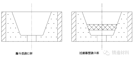 浇口杯:它形如漏斗,结构简单,可单独制作,也可以在铸型直浇道顶部作出。浇注重要件时,宜采用带过滤器的浇口杯,如图所示。