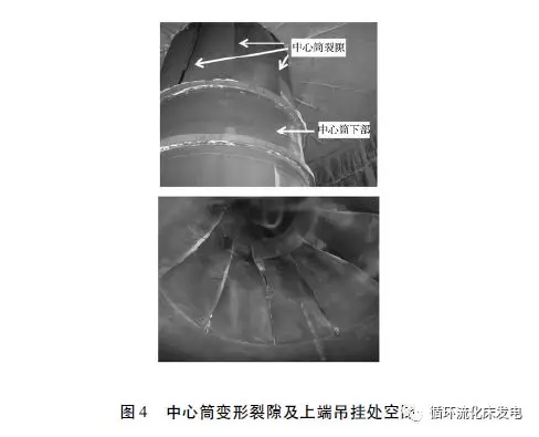 旋风分离器是循环流化床锅炉的关键部件,其主要作用是将大量高温固体物料分离出来送回炉膛,以维持炉膛循环流化运行,保证燃料和脱硫剂多次循环。锅炉原有旋风分离器筒体直径5408mm,进口截面4828×2028mm,中心筒直径1912mm,插入深度2900mm。分离器中心筒由上下两个筒体组成,上部筒体由12片扇形长板拼接而成,下部筒体为整圆设计,材质为1Cr20Ni14Si2,厚度6mm。受到锅炉启停及中心筒区域温度较高的影响,上部筒体扇形长板之间原有的拼接缝逐渐演变成为裂隙,加之扇形长板彼此之间膨胀不均,变形严重,裂隙逐步加大,宽度达到50~200mm,如图4所示。