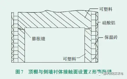 衬体设计时必须标明膨胀缝的留设位置。一般情况下,炉墙拐角处留设5~10mm宽的膨胀缝,然后沿炉长或炉宽每隔4~5m留设1条3~6mm宽的贯穿膨胀缝,炉墙高度方向每隔1.0~1.2m设置1条宽5mm、深100~150mm的不贯穿膨胀缝,缝内填加耐火耐高温陶纤纸。炉顶高温部位沿炉长和炉宽的方向每隔1.5~2.0m留设1条3~6mm宽的贯穿膨胀缝,低温部位则每隔2~5m留设1条同样宽度的膨胀缝。膨胀节处设置L形膨胀缝(如图6),顶棚衬体与侧墙衬体接触面设置Z形膨胀缝(如图7)。