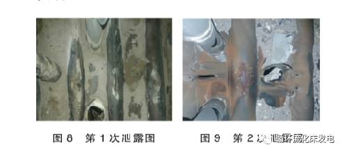 从4处明显漏点孔周边进行检查,左侧布风板后排第81根与第82根水冷壁之间风帽套管与鳍片焊口(浇注料内部隐藏部位)存在夹渣缺陷,机组运行中,水冷风室内热风通过夹渣进入布风板浇注料内,随运行时间增加漏泄风在布风板与浇注料内形成风道,在浇注料颗粒脱落的情况下对第81根水冷壁管表面进行冲刷,导致水冷壁管减薄,因承受不了工质压力而漏泄,该处漏泄管上部及下步风磨损明显,第二漏点泄露后对第80、82根管发生折射吹扫,造成第80根管有一处明显漏点,第82根管有两处明显漏点,最后由于漏泄爆口越来越大,导致浇注料脱落,蒸汽冲刷风帽,造成风帽吹损。