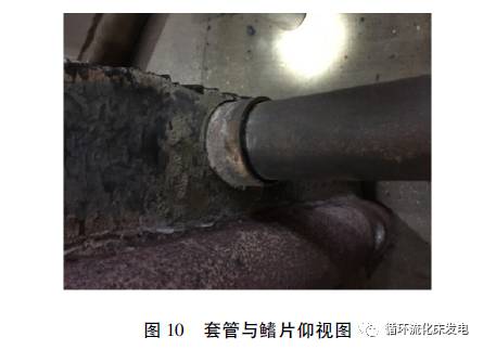 本次漏泄事件已是第三次漏泄,且此次泄露与之前两次泄露外观情况基本相同,都是中间布风板水冷壁有1长爆口,两遍水冷壁管有小爆口,因此怀疑设计存在缺陷,对布风板图纸及锅炉说明书进行了检查。由图纸发现,风帽套管与鳍片焊口应为双面焊接,但漏泄管套管与鳍片只是上部单面焊接,且上部焊接质量较差,发现多处夹渣、气孔及焊接不全情况,与哈锅厂联系后确认为设备原始缺陷,下部应是缺少一道工艺,下部所有焊口都没有焊接,如果双面焊接,此漏泄情况基本不会发生。