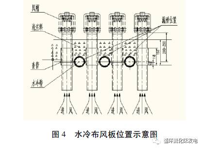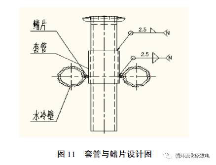 水冷管屏的管子直径Φ76×8mm,节距174mm,材料:SA-210C,2696个不锈钢制成的钟罩式风帽按一定规律焊在水冷管屏鳍片上。在炉膛裤衩腿内底部各有四个排渣口,所有风帽底部到耐火材料表面的距离保持50mm。