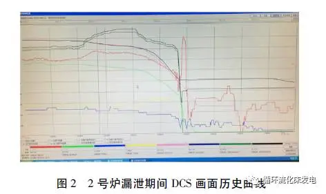 2016年12月25日9时36分,2号机组负荷197MW,左侧床温874℃,右侧床温889℃,左侧床压6.8kPa,右侧床压7.4kPa,给水流量656t/h,主蒸汽流量641t/h,炉膛压力-35Pa,A引风机出力37Hz,B引风机出力38Hz,烟气湿度9.6%,主再热蒸汽温度541℃/537℃,主蒸汽压力15.1MPa,受热面无超温现象。11时36分锅炉汽水流量差由15t/h,升至42t/h,A引风机出力由40.2Hz涨至47Hz,B引风机出力由41.2HZ涨至49HZ,烟气湿度由9.6升至10.9,初步判断炉内四管漏泄,立即降低机组负荷及降低主蒸汽压力。11时50分锅炉左侧床温降低,判断炉膛受热面漏泄,停止石灰石系统运行,同时申请停机。20时30分开启锅炉左侧炉膛人孔门检查发现锅炉左侧布风板第80、81和82根水冷壁漏泄,漏泄点距炉左1.5m处。