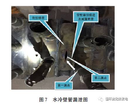 1)根据爆口宏观判断本次漏泄的原因为水冷壁之间风帽套管与鳍片焊口存在原始缺陷,且上部焊接质量较差,在浇注料颗粒脱落的情况下对水冷壁管表面进行冲刷,导致水冷壁管减薄。