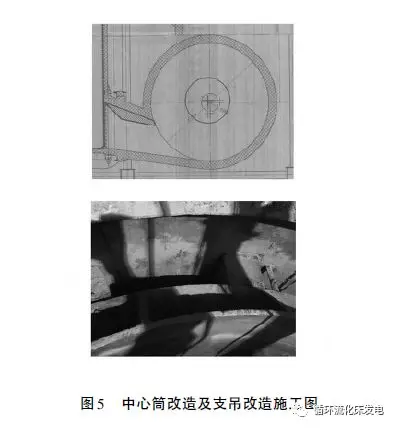 采用自由吊挂式安装,借助原旋风筒环形槽钢,在环形槽钢上焊16个支架,中心筒通过上部大筋板安放在16个支架上,中心筒与支架间自由配合,可相对滑动。由于大筋板、三角筋板和中心筒为一体铸造,具有较高的强度,有效避免中心筒在运行中易受胀缩应力而变形成椭圆的问题。为了保证密封,在筒体上端密封浇注料底部加一圈密封环板,用岩棉把筒体与浇注料缝隙塞满后,焊接一圈密封环板,有效的防止烟气短路问题。