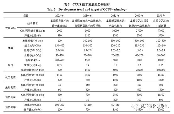 CCUS作为一项有望实现化石能源大规模低碳利用的技术,是我国未来减少CO2排放、保障能源安全和实现可持续发展的重要手段。随着示范项目范围扩大,未来有望建成低成本、低能耗、安全可靠的CCUS技术体系和产业集群,为化石能源低碳利用提供技术选择,为应对气候变化提供有效的技术保障,为经济可持续发展提供技术支撑。根据中国21世纪议程管理中心资料,整理后的CCUS技术在我国发展趋势和目标如表5所示。